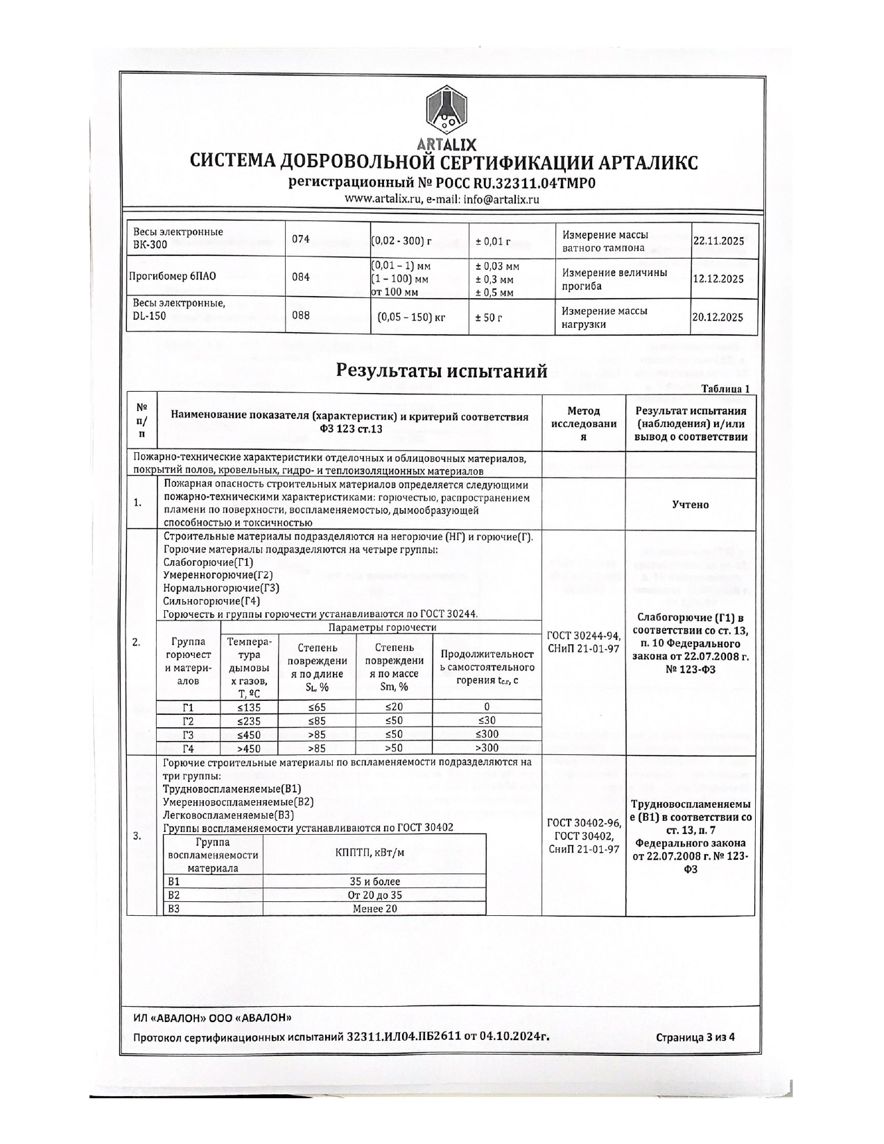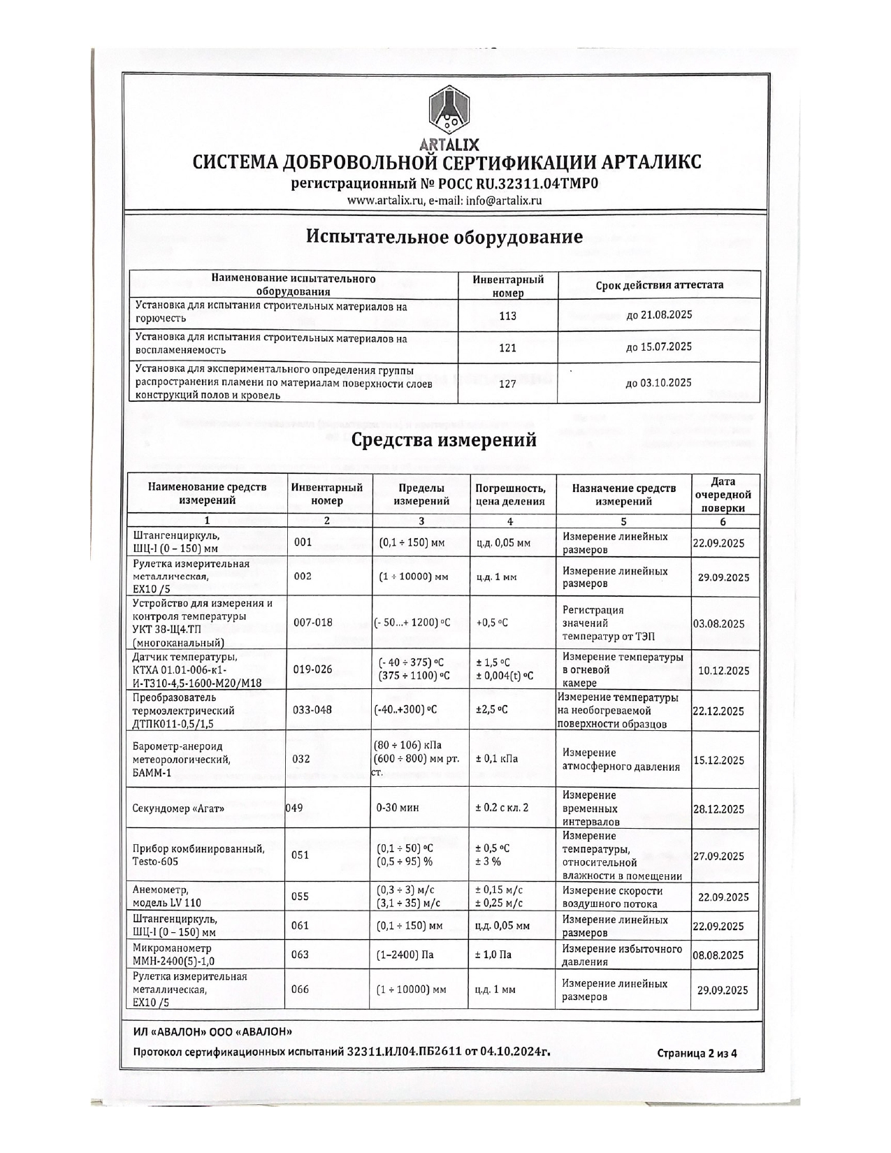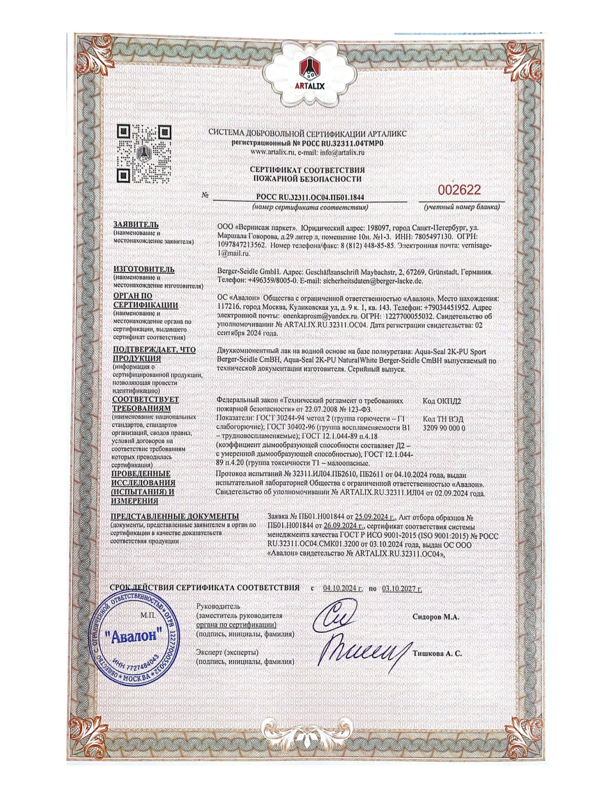 Сертификат соответствия пожарной безопасности от Artalix