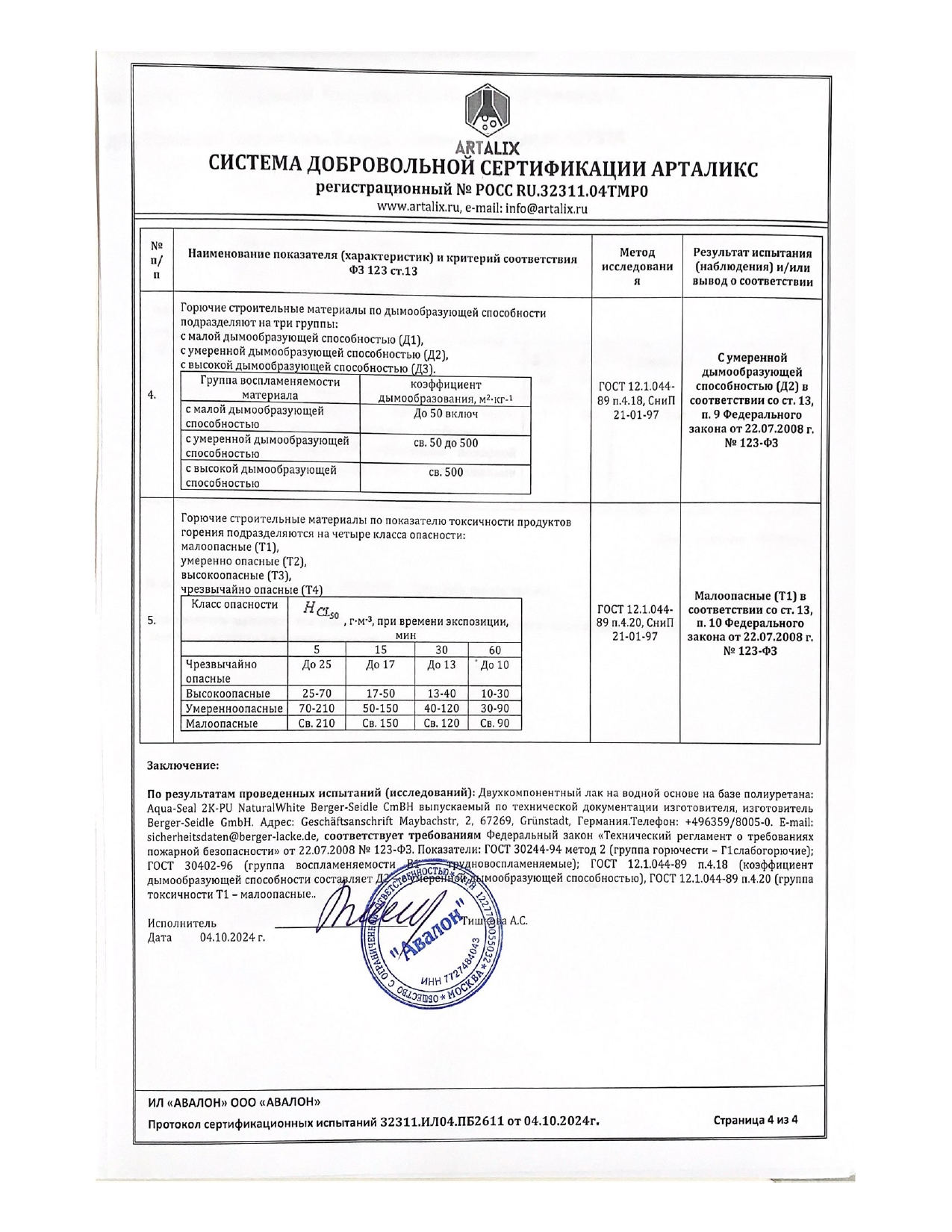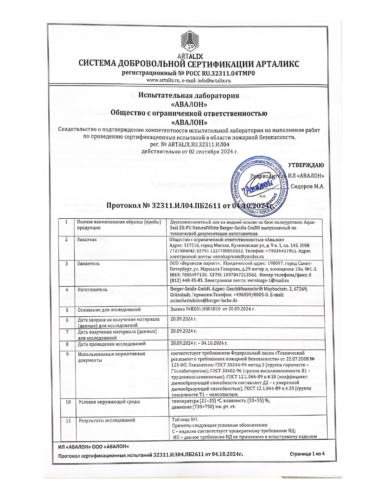 Протокол испытаний на лак Berger Natural White