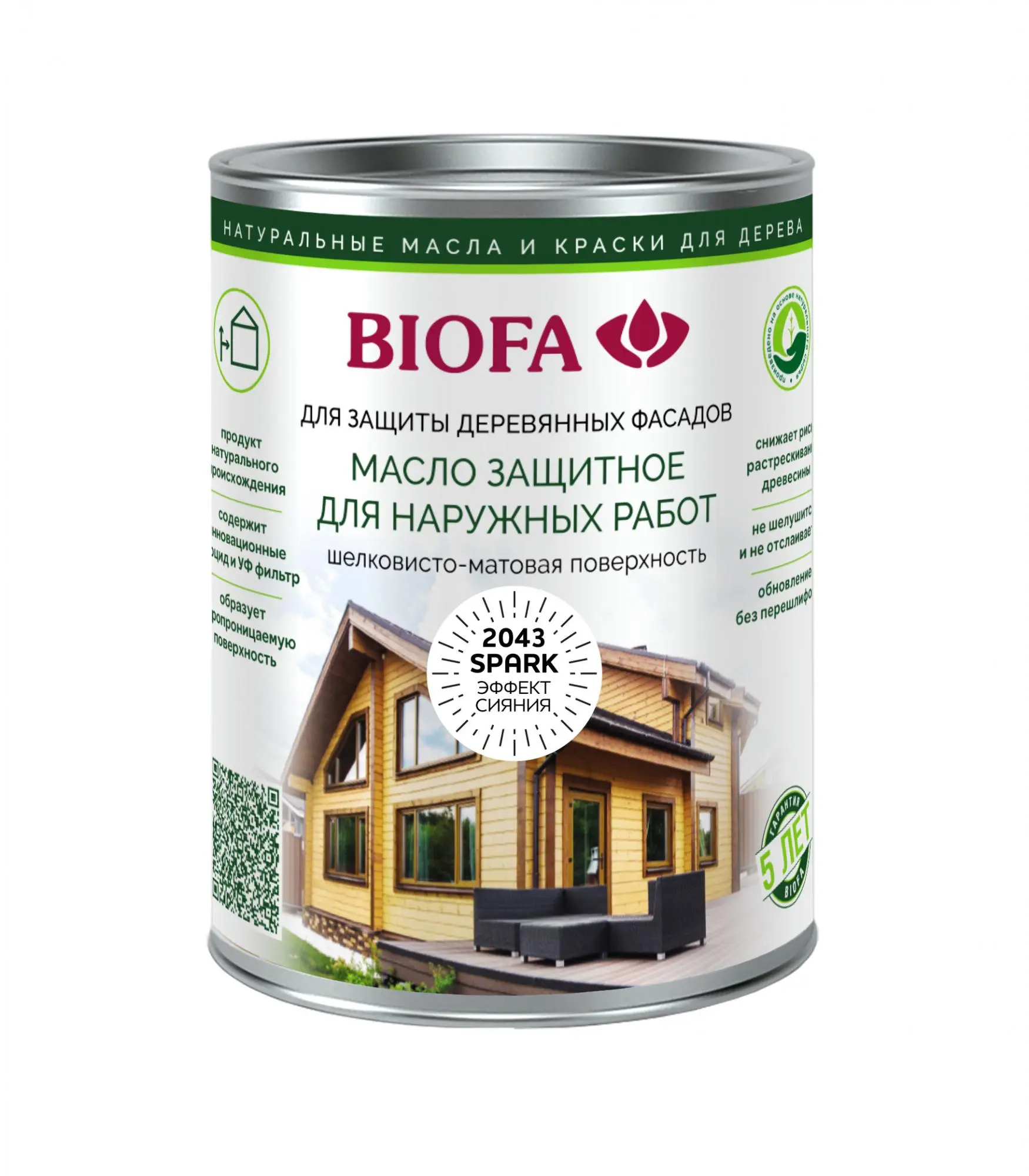 2043 BIOFA Масло защитное для наружных работ с эффектом сияния — Высококачественное покрытие для наружных работ, изготовленное из натурального сырья. Применяется для защиты и декоративной обработки деревянных фасадов и прочих поверхностей, выполненных из любых сортов древесины.