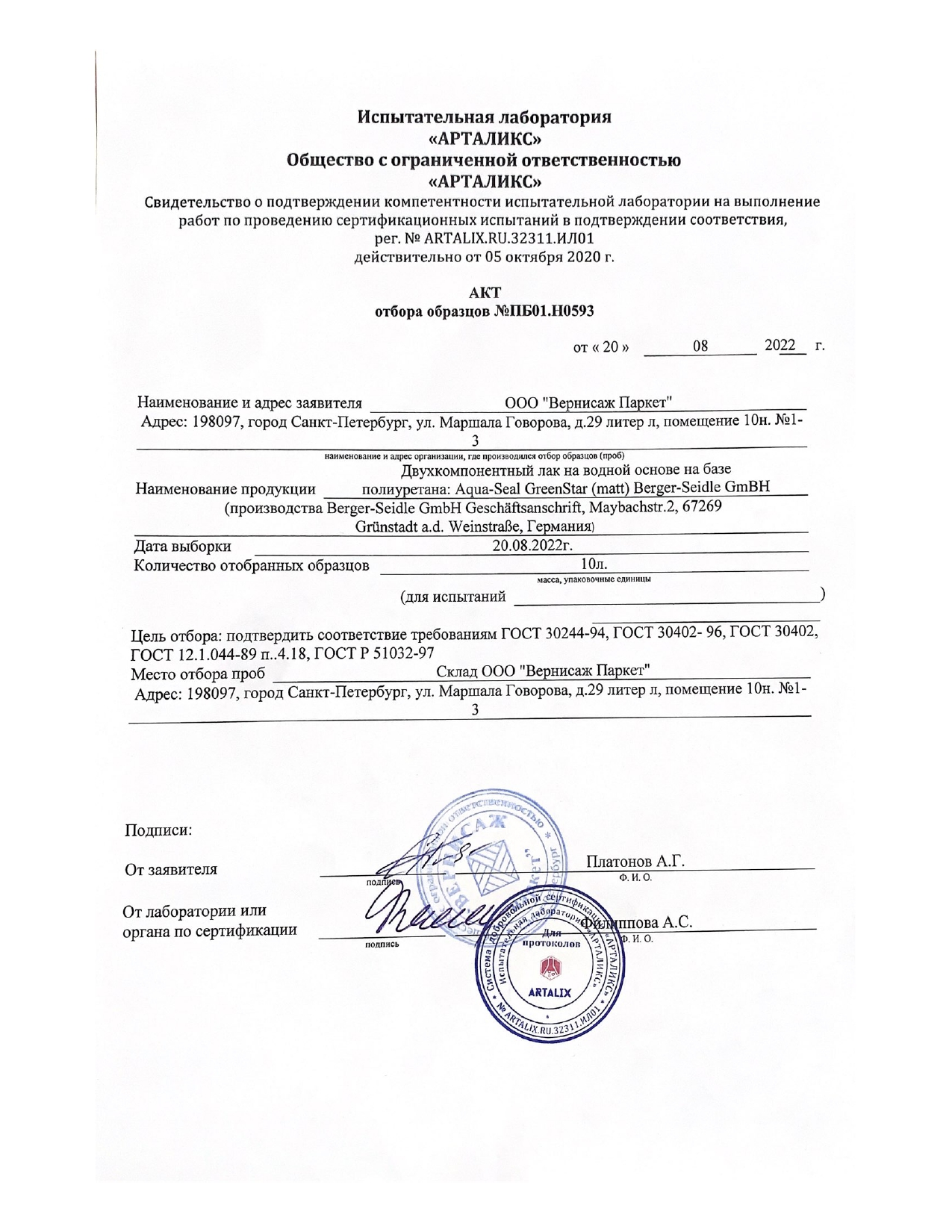 Акт отбора проб для испытаний лака Berger Green Star