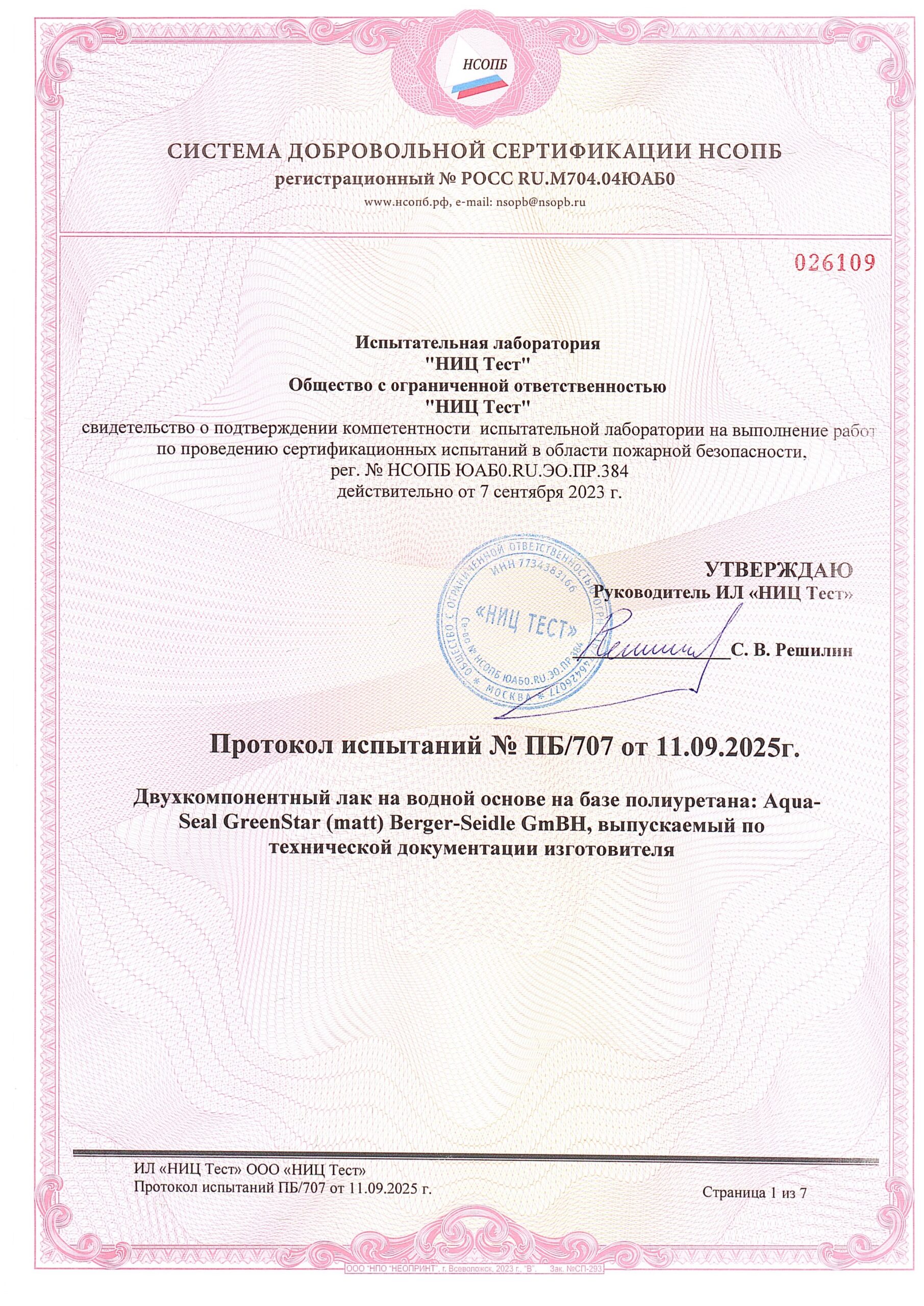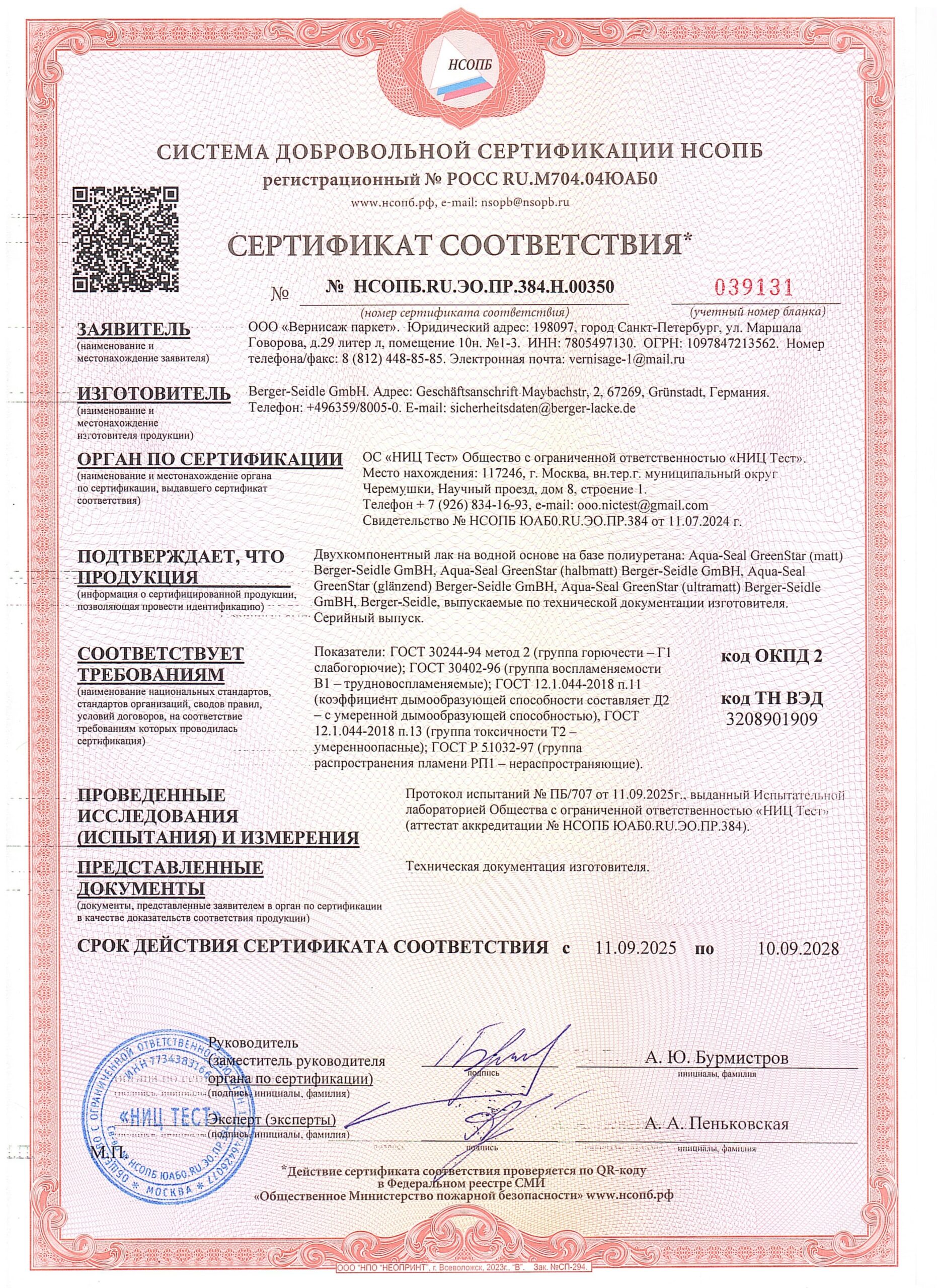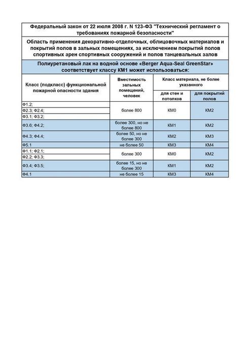 Лак Berger GreenStar имеет пожарный сертификат российского образца с высшим классом Г1.
